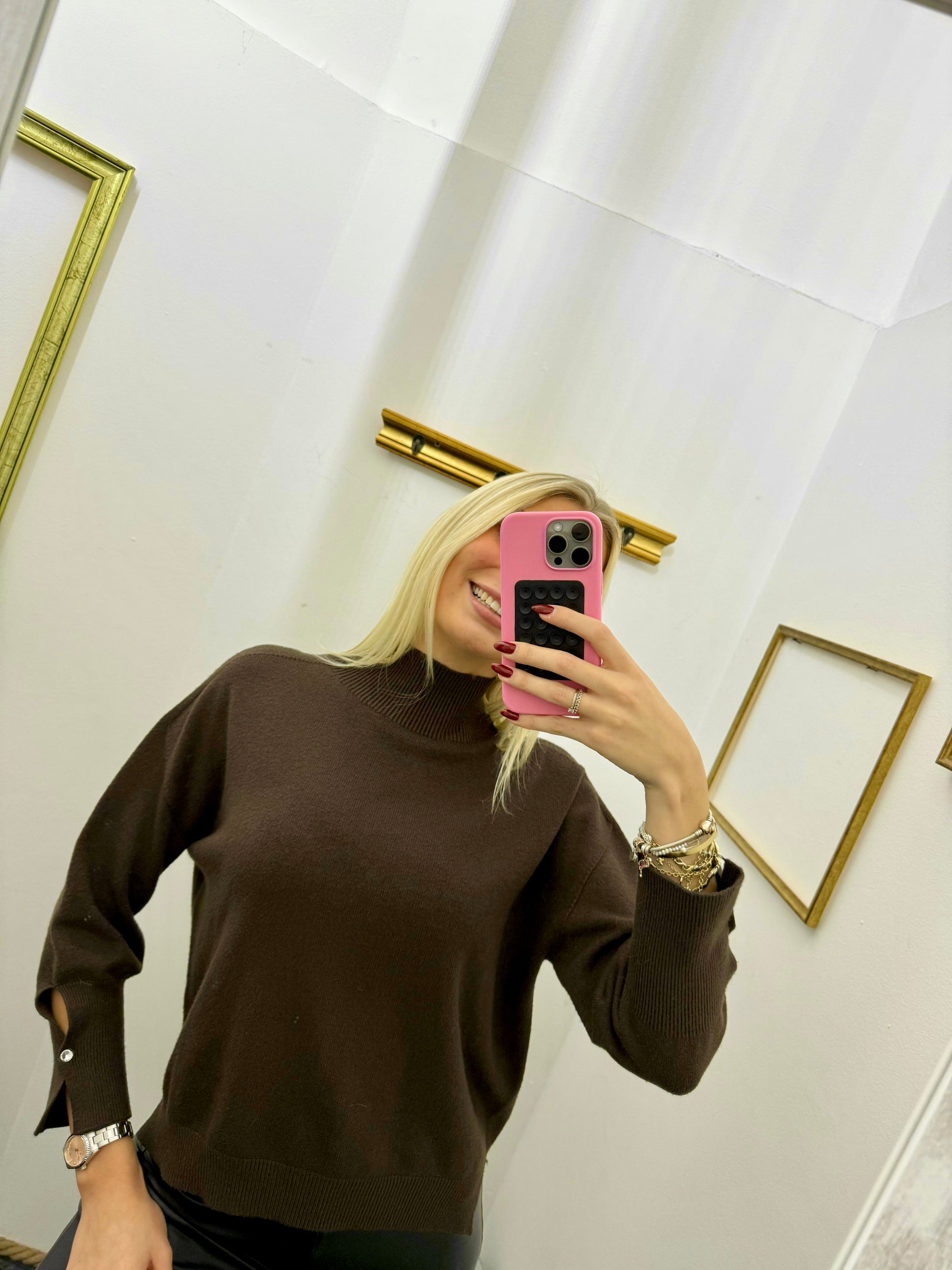 Maglia a collo alto con bottone gioiello sul polsino, spacchetti laterali e lunghezza leggermente più lunga sul retro. Vestibilità morbida e linee pulite, ideale per un look elegante e raffinato.