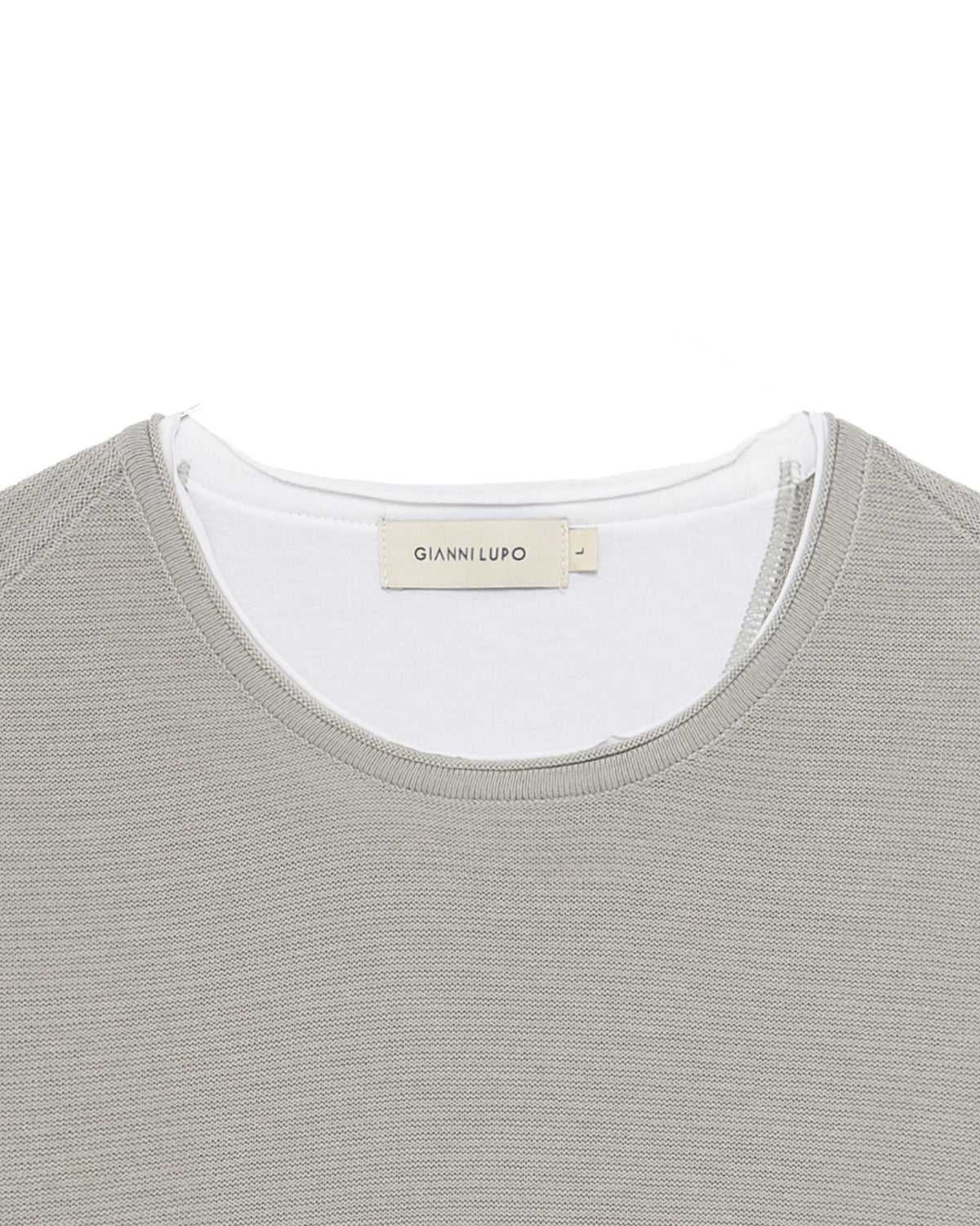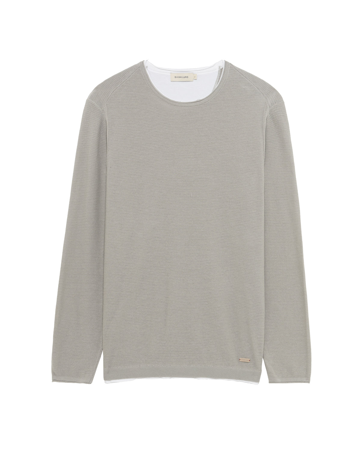 Questo maglioncino a girocollo in maglia leggera presenta un design essenziale a doppio strato, caratterizzato da un profilo a contrasto che emerge dallo scollo e dal fondo per un effetto rifinito e moderno. Il modello è definito da una lavorazione a micro-texture uniforme, con maniche lunghe dal taglio raglan che assicurano una vestibilità confortevole e naturale sulle spalle.