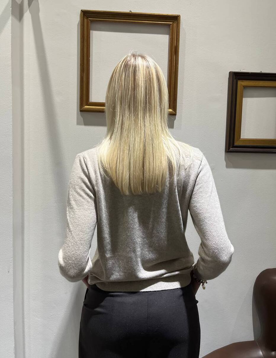 Questo maglioncino presenta una vestibilità regolare e un semplice scollo a girocollo. È realizzato in una maglia fine, che lo rende un capo leggero e versatile.