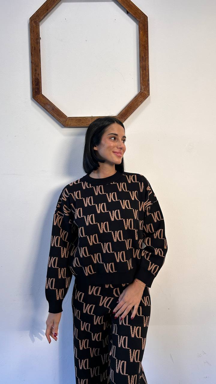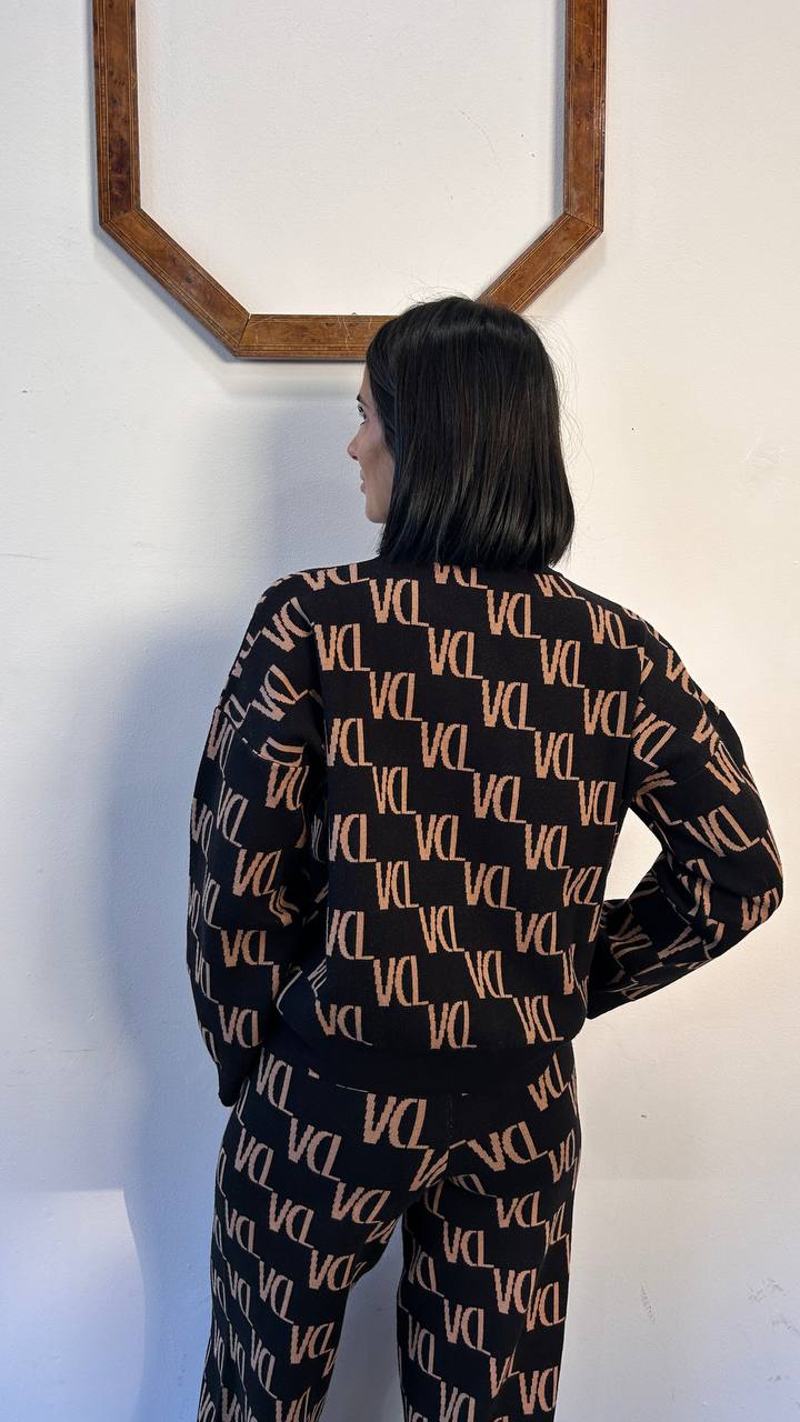 Maglioncino girocollo con un design a maglia jacquard, caratterizzato da un motivo ripetuto con le lettere "VCL". Il contrasto cromatico tra il colore scuro e il colore chiaro crea un effetto visivo moderno ed elegante. Il taglio è leggermente ampio, con maniche lunghe e un orlo che arriva ai fianchi, rendendolo comodo e versatile per un outfit casual.