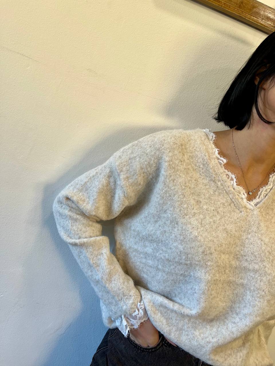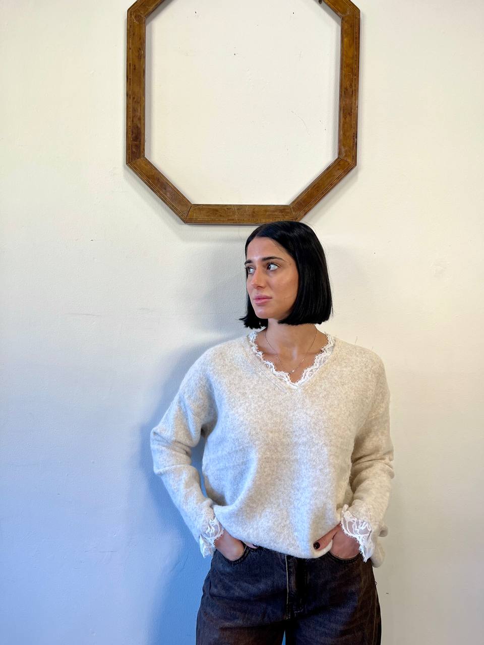 Questo maglione unisce comfort e femminilità grazie al tessuto morbido e alla vestibilità rilassata. Presenta un elegante scollo a V impreziosito da un delicato bordo in pizzo, che dona un tocco romantico e sofisticato. Le maniche lunghe e il taglio leggermente over-size lo rendono perfetto per un look casual-chic. È ideale da indossare con jeans per un outfit quotidiano raffinato.