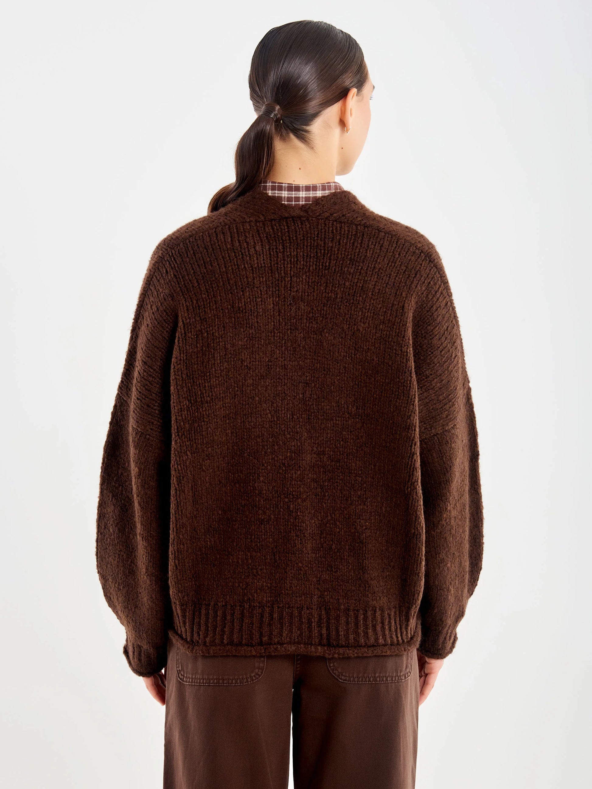 Maxi cardigan maniche lunghe scollo a v. Con tasche frontali applicate. Chiusura frontale con bottoni. Finiture in maglia a costina.