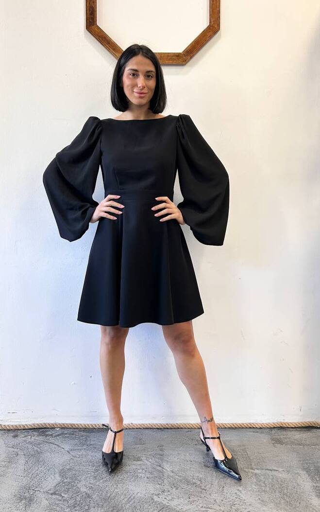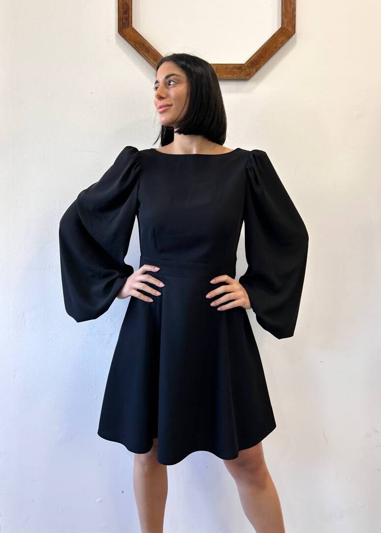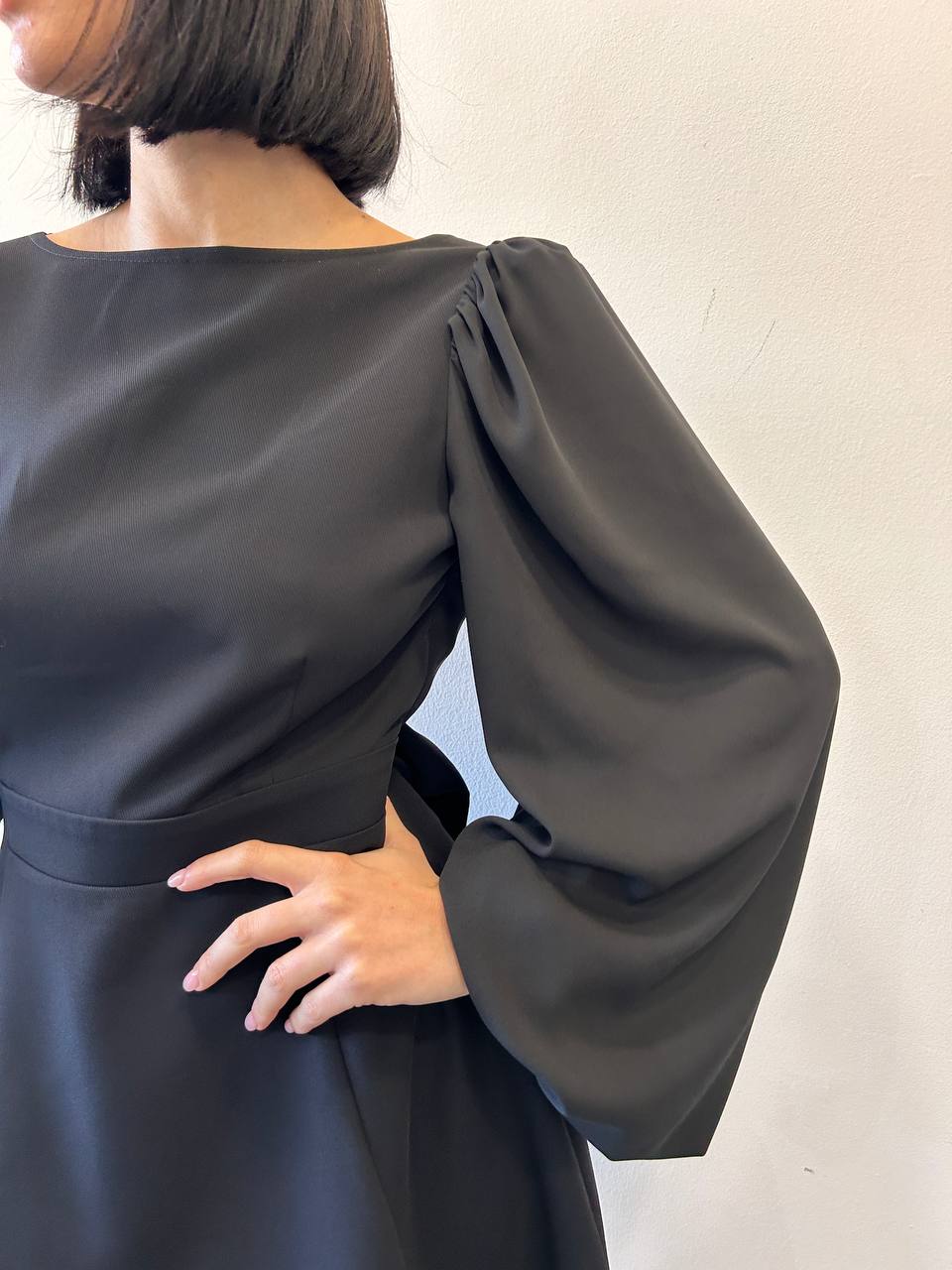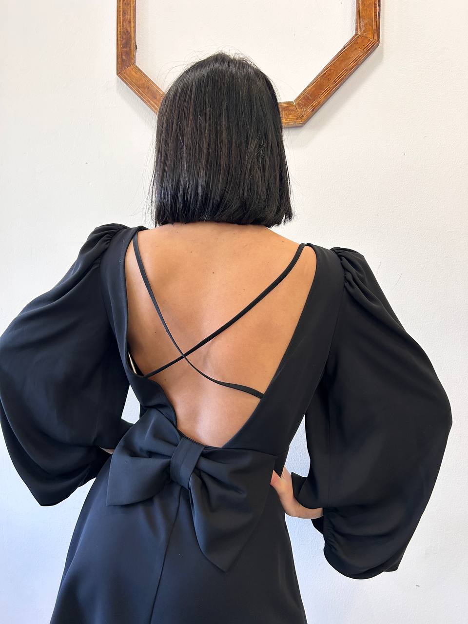 Questo mini abito presenta maniche lunghe voluminose con spalle a sbuffo. Ha uno scollo quadrato sul davanti e una profonda scollatura sulla schiena con lacci incrociati. L'abito ha un taglio corto con gonna svasata e un maxi fiocco applicato sulla parte bassa della schiena.