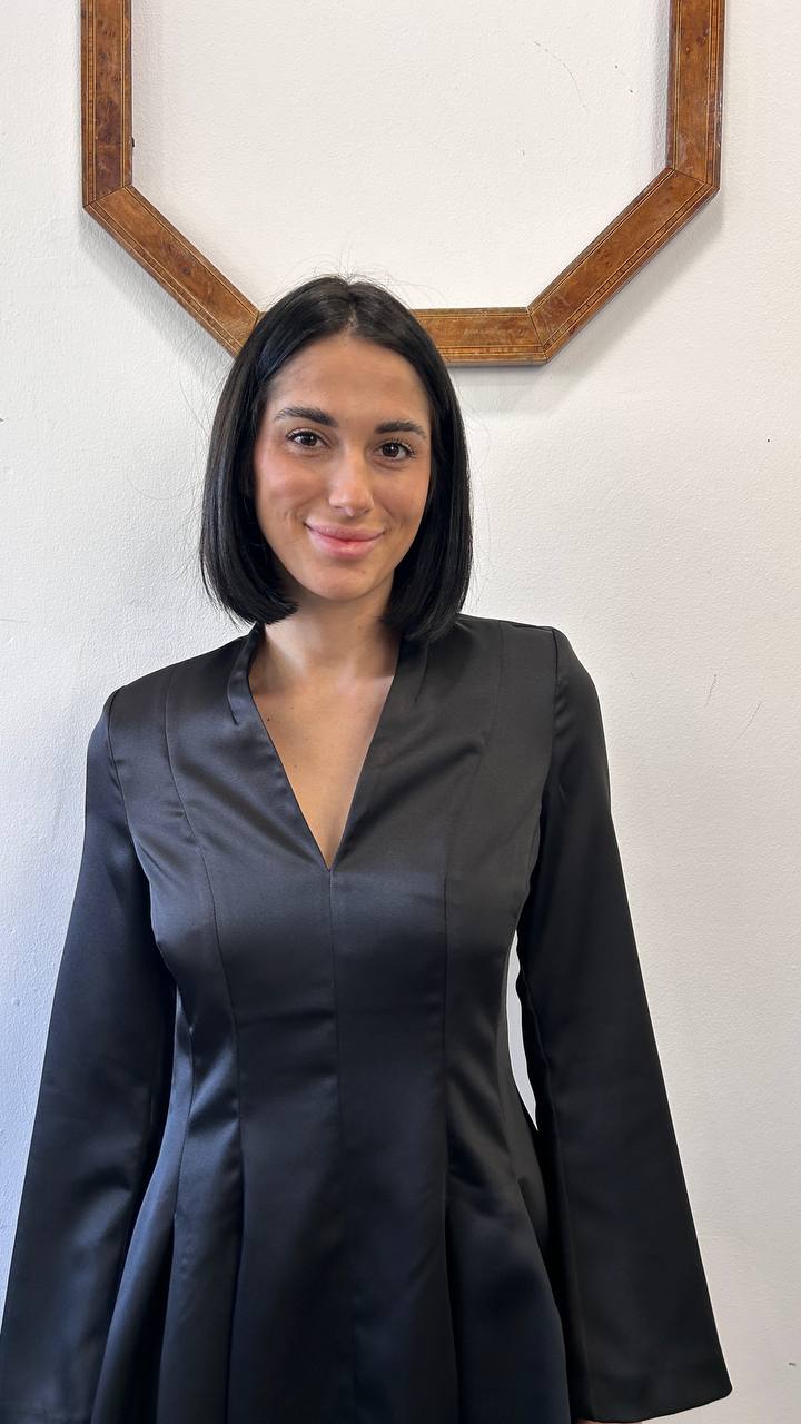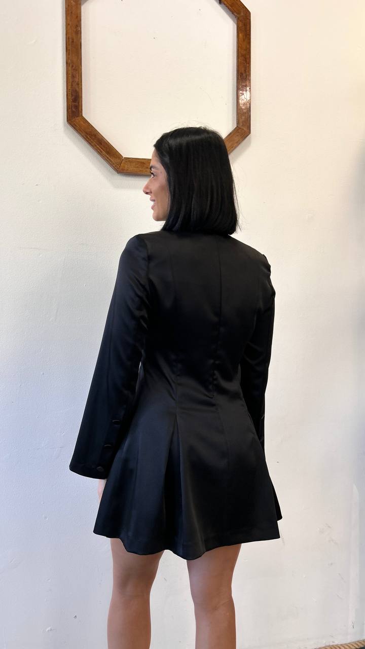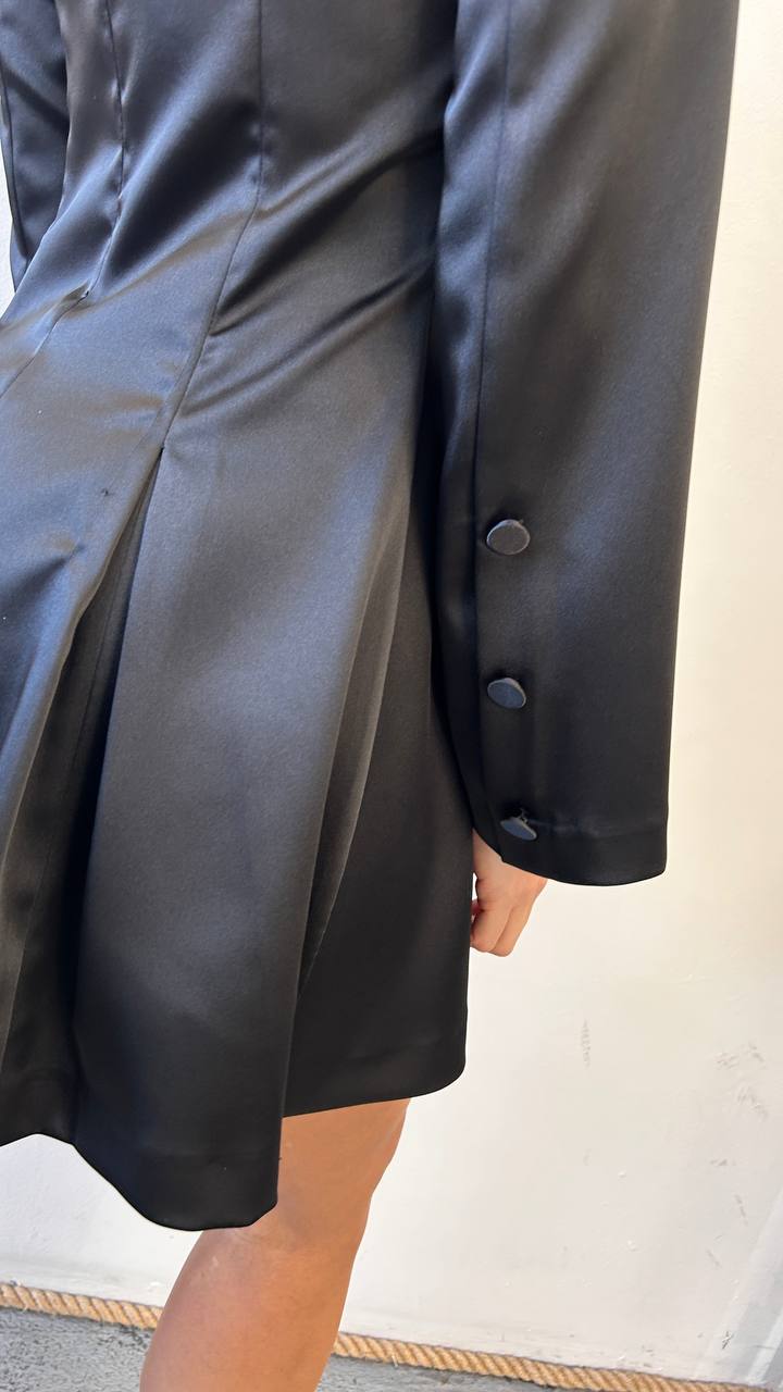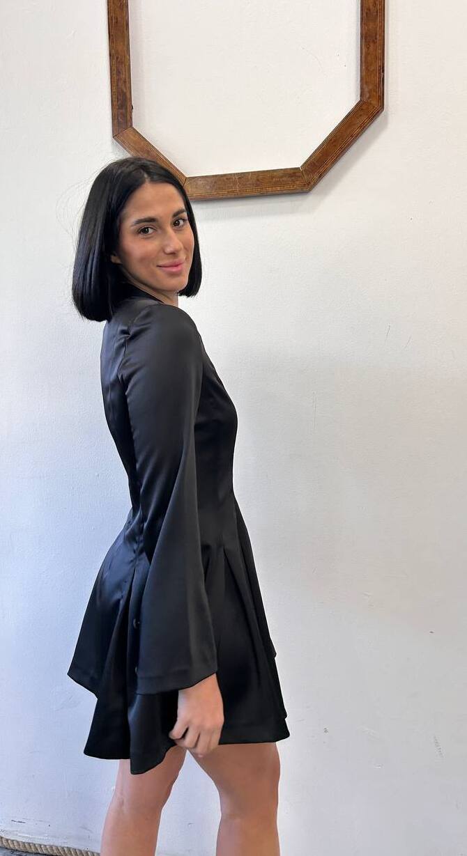 Questo mini abito presenta maniche lunghe con polsini svasati. Ha uno scollo a V e una linea aderente sul corpetto che si apre in una gonna corta e svasata con pieghe sul retro.
