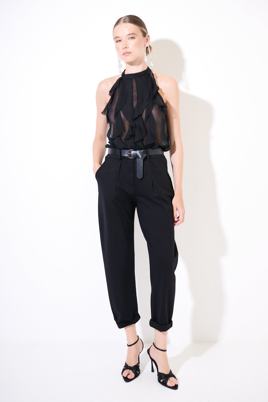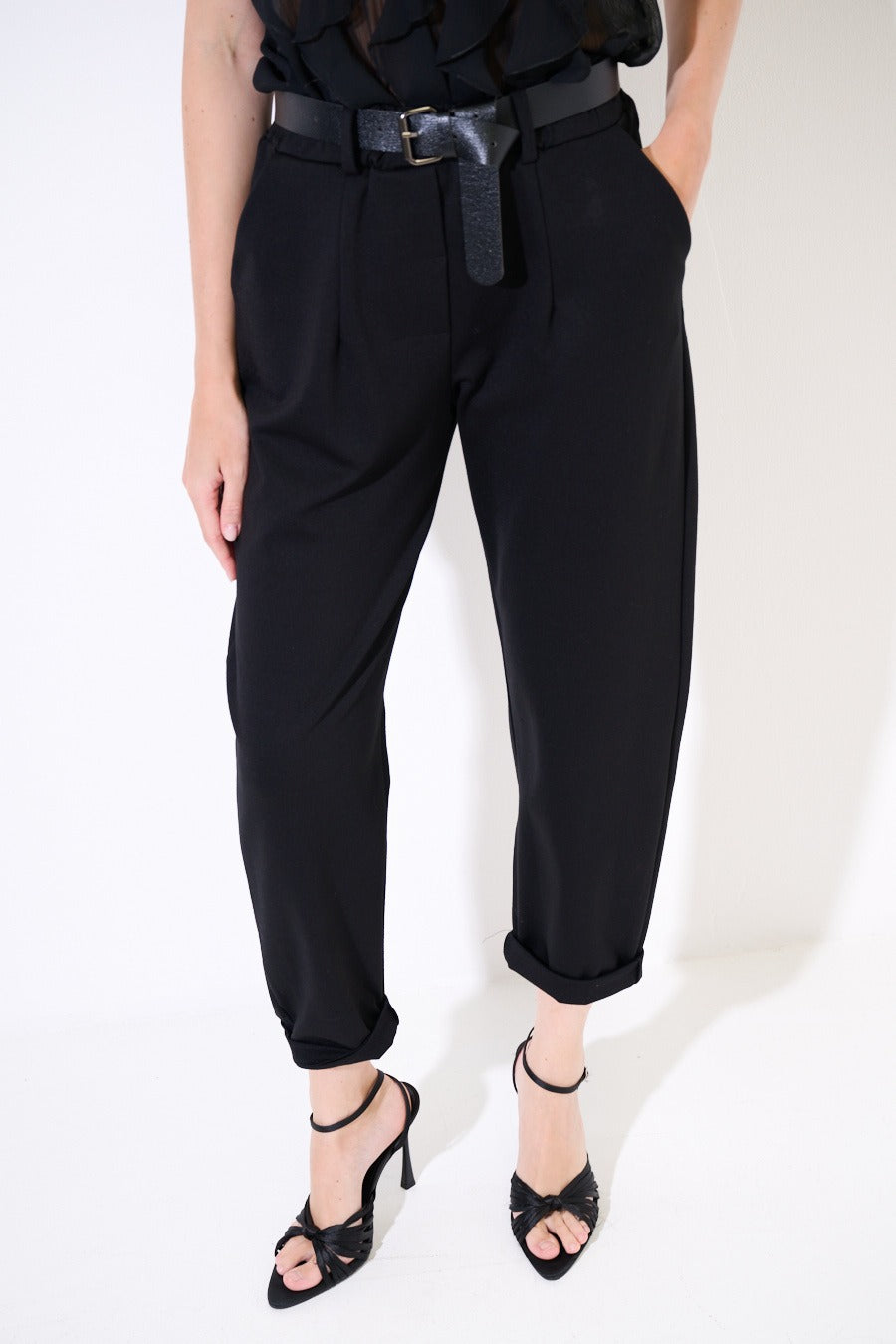Pantalone a ovetto in punto milano con pinces chiuse sul davanti, tasche a filetto sul retro e con cintura ed elastico in vita.