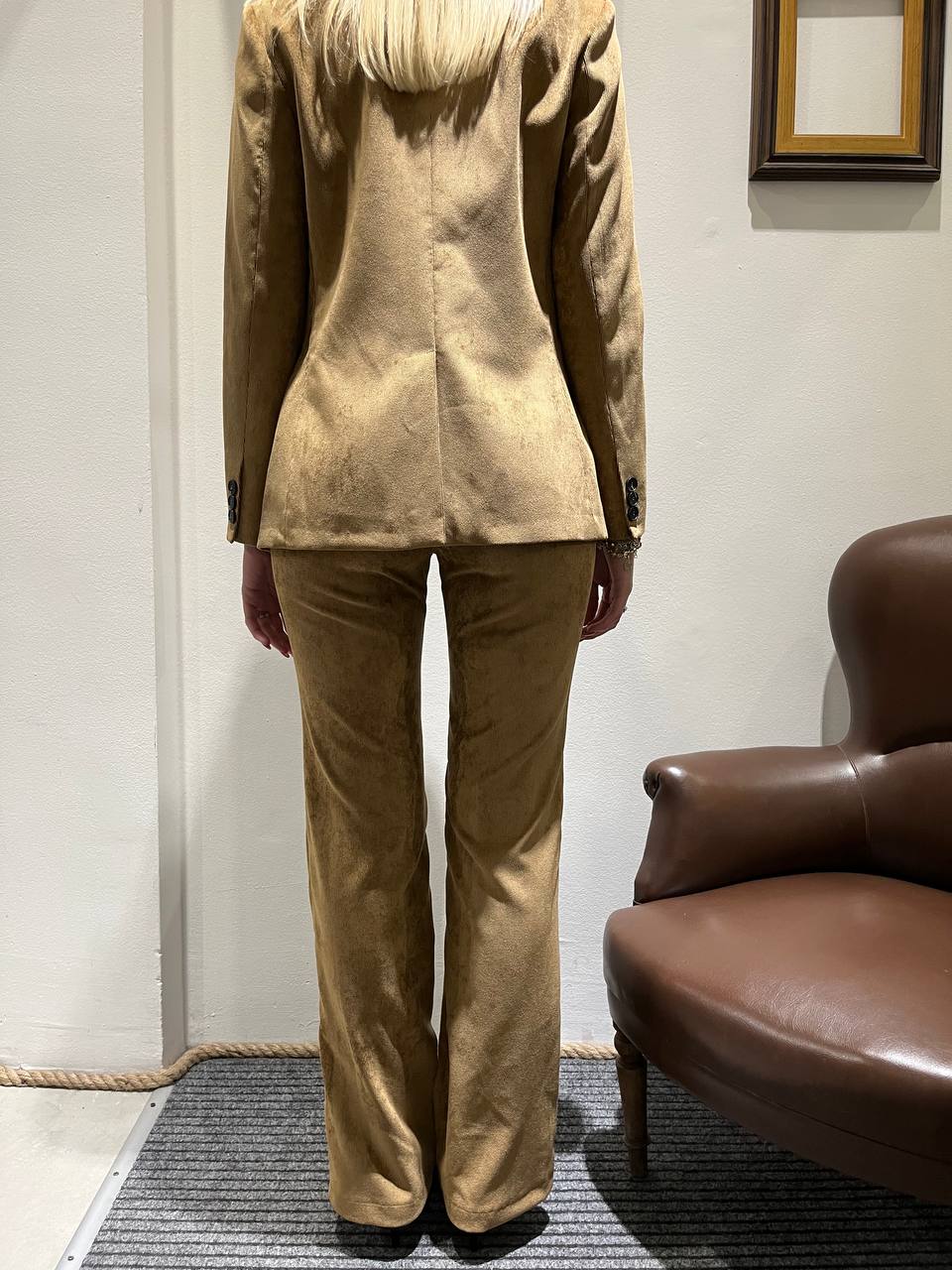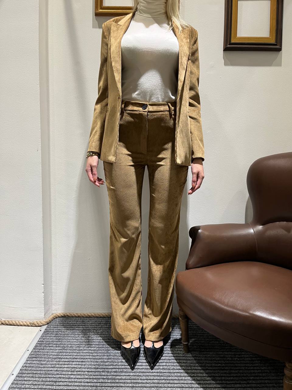 Questi pantaloni presentano una vestibilità dritta e una gamba a zampa che cade in modo fluido. Sono realizzati in un tessuto millerighe velluto. Hanno una vita alta con chiusura frontale.