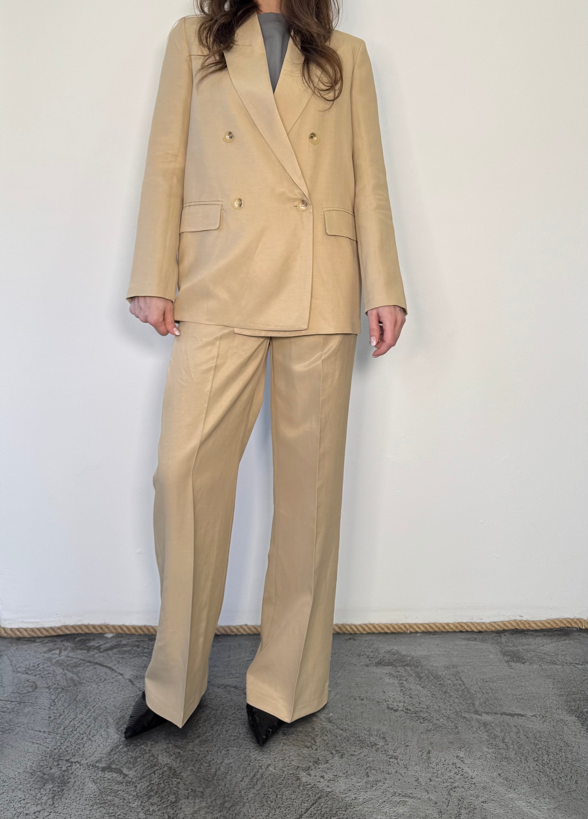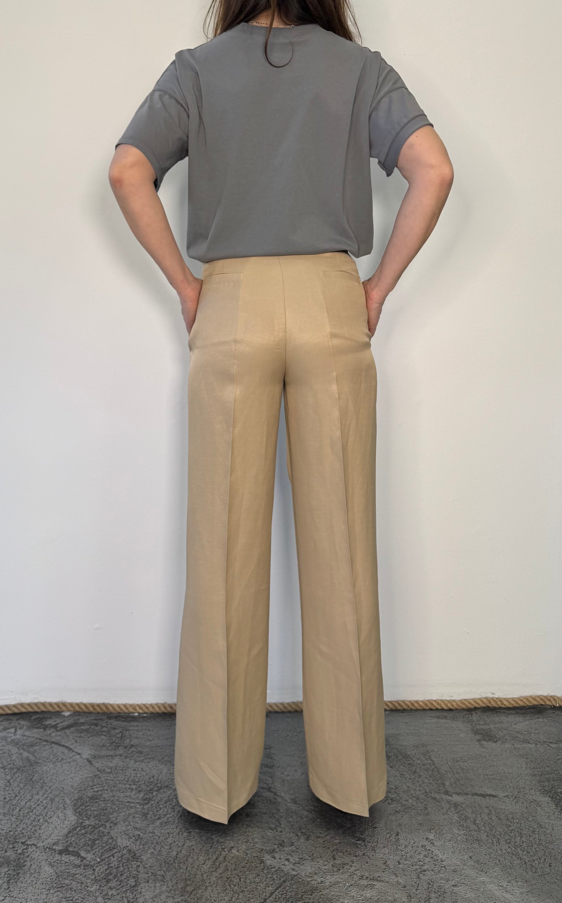 Questi pantaloni presentano un taglio sartoriale pulito ed essenziale, caratterizzato da una vita alta rifinita senza passanti. Il modello è dotato di una pratica tasca posteriore a filetto. Realizzati in un tessuto leggero dalla finitura opaca, offrono una gamba dritta che cade morbidamente, rendendo il capo perfetto per completare un set coordinato o per look professionali sofisticati.