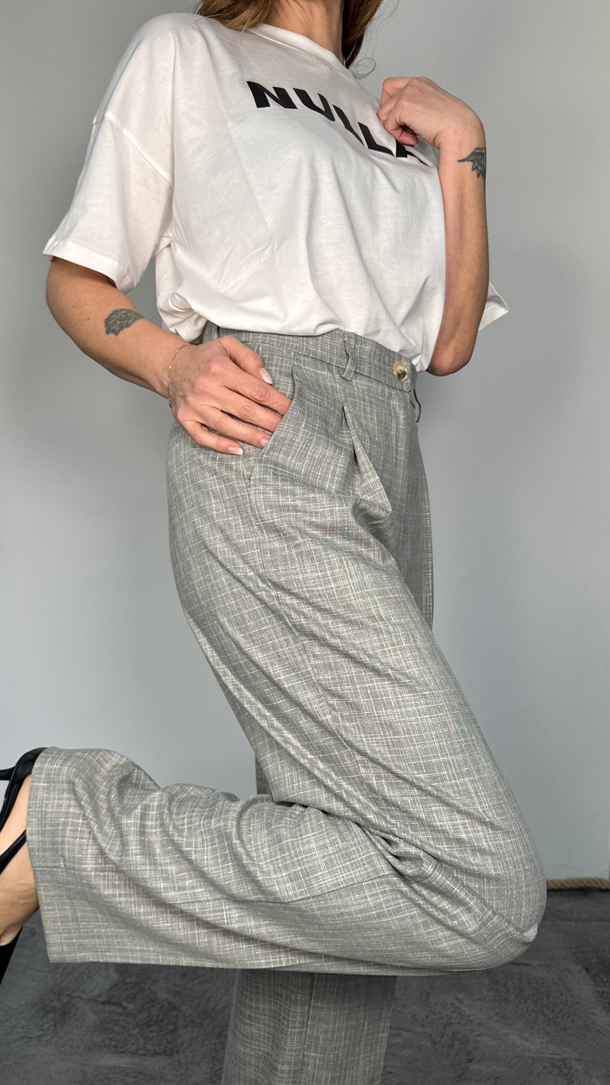 Questi pantaloni sartoriali presentano una raffinata trama fiammata che crea un delicato effetto materico sulla superficie del tessuto. Il modello è caratterizzato da una vita definita con passanti per cintura, tasche laterali a filo e una tasca posteriore a filetto. Il taglio dritto e la gamba ampia offrono una silhouette fluida e sofisticata, rendendo il capo ideale per completare un set coordinato o per elevare look business contemporanei.
