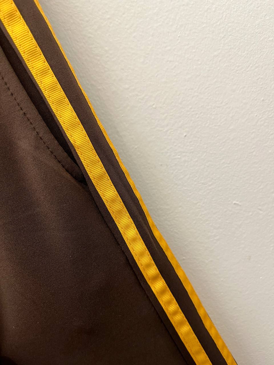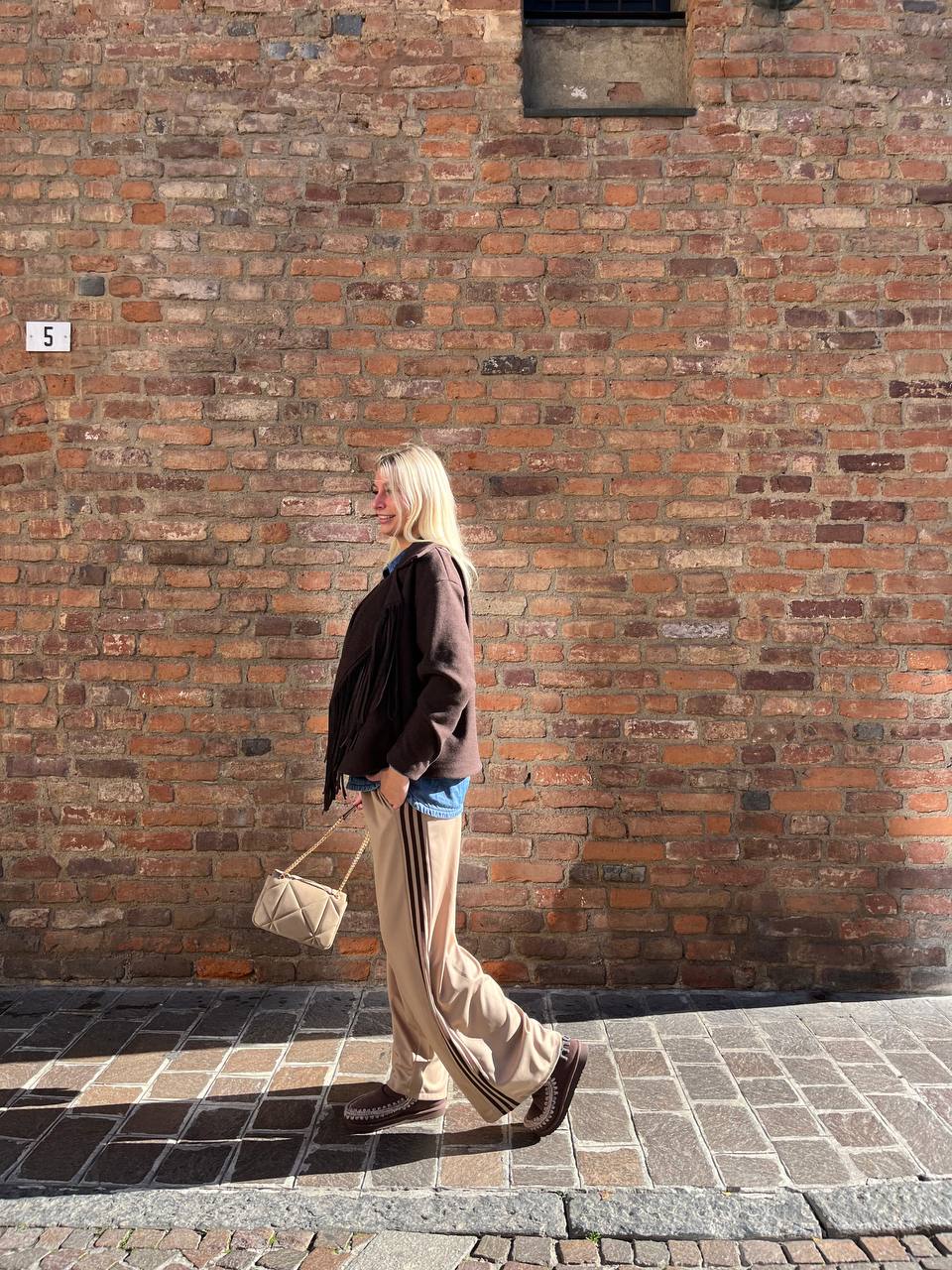 Questi pantaloni sportivi sono caratterizzati da un taglio dritto e una vestibilità comoda. Hanno un elastico in vita che assicura una vestibilità facile. Il dettaglio distintivo è la banda verticale che corre lungo i lati esterni di entrambe le gambe. Sono un capo casual, ideale per il tempo libero.