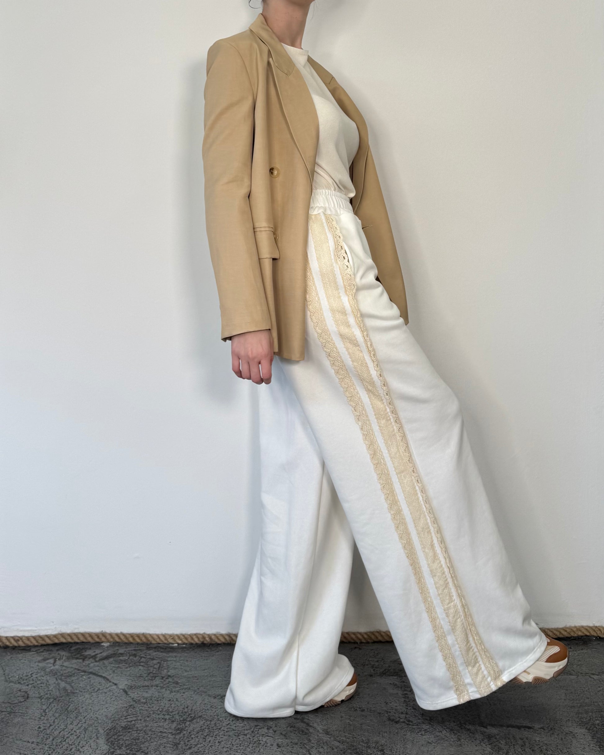 Pantalone tuta a gamba larga con tasche laterali. Profilo della gamba ad uncinetto.