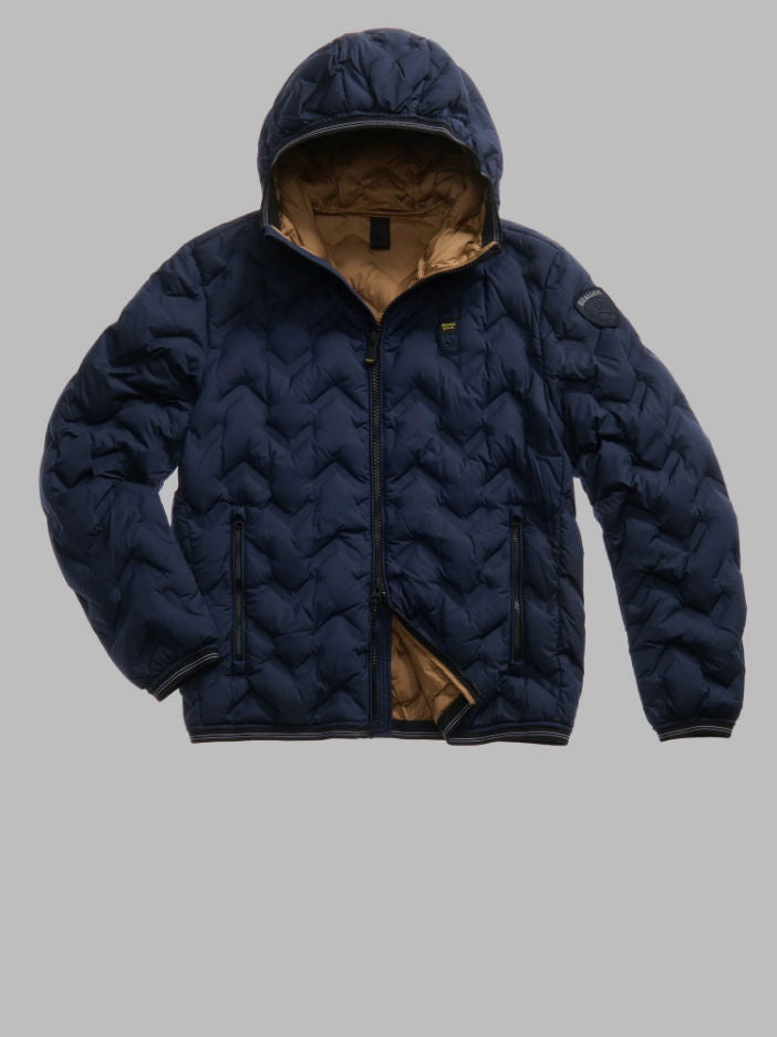 Piumino con cappuccio fisso e profilo dall’aspetto aderente e increspato. Cuciture nastrate ad angoli che dona un tocco innovativo e dinamico.