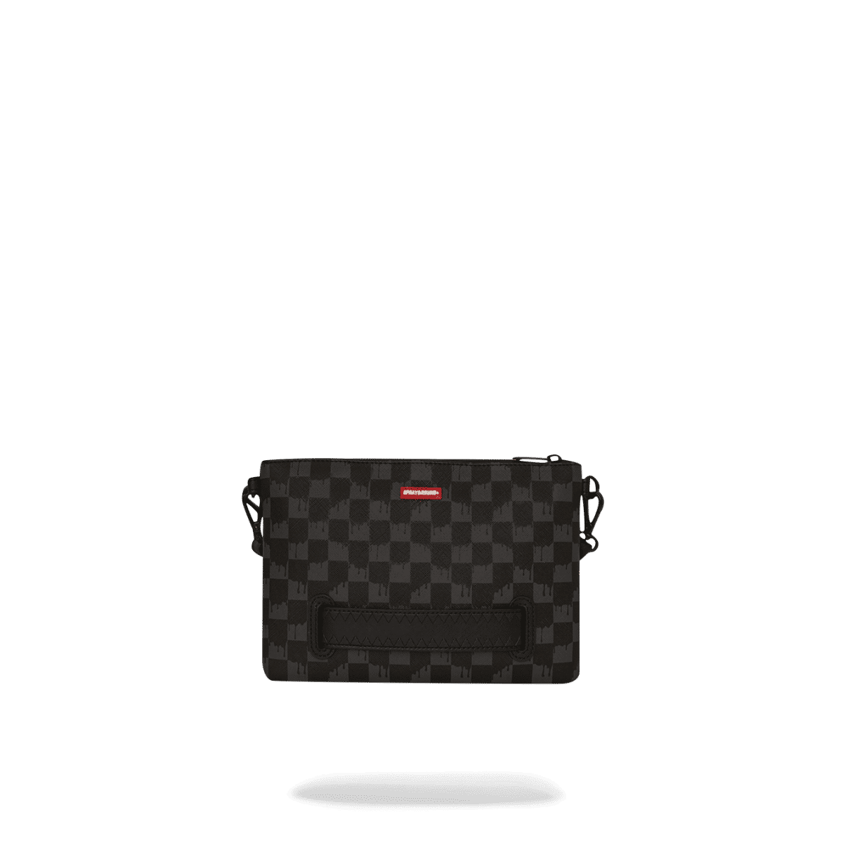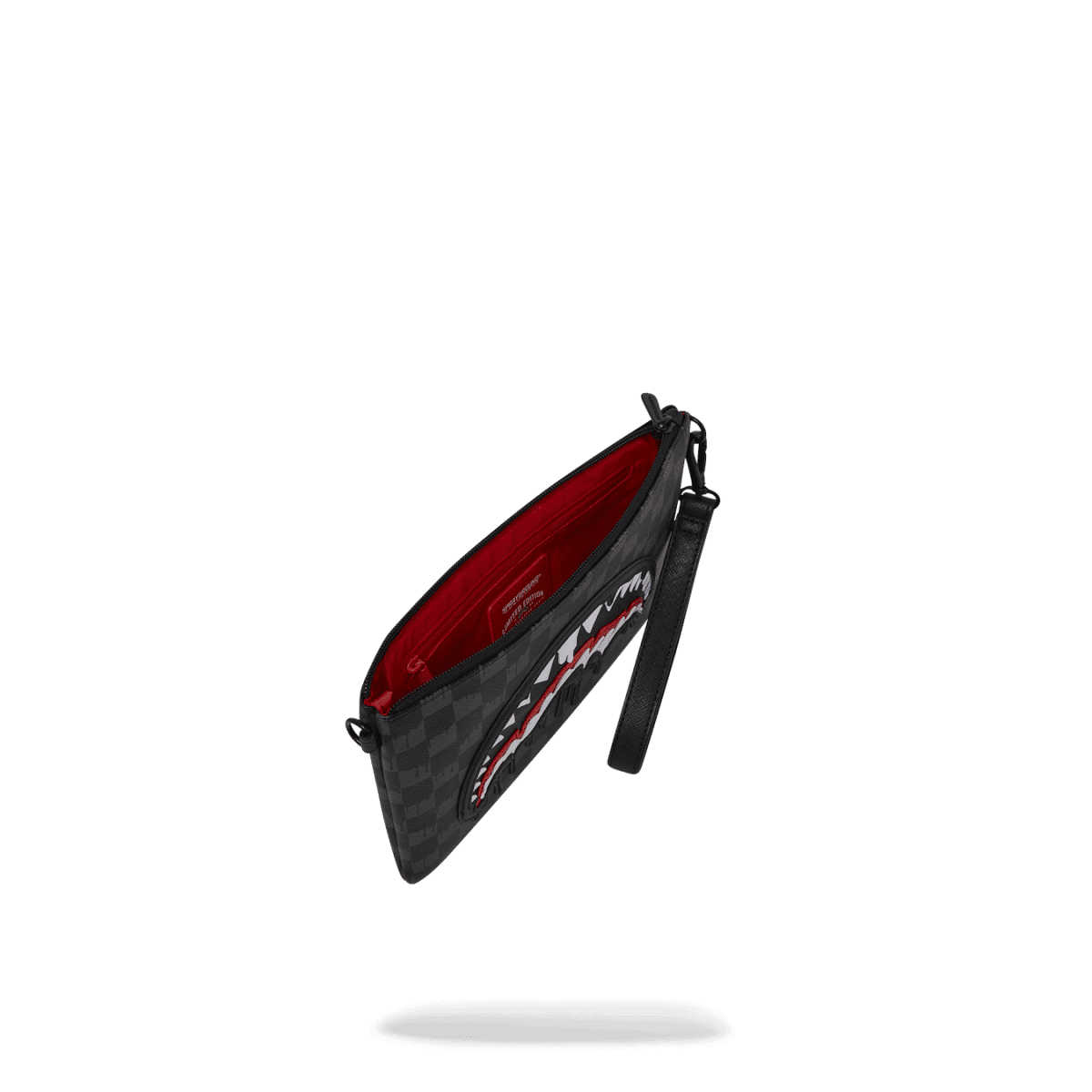 SPRAYGROUND Pochette Dripping Sharks In Paris nera per uomo e donna. Compatta e versatile, è dotata di chiusura con zip e interno rivestito in fodera rossa, perfetta per custodire in sicurezza i tuoi oggetti essenziali. Il laccio da polso removibile e la tracolla regolabile offrono diverse modalità di utilizzo: a mano, a spalla o crossbody, adattandosi a ogni occasione, dal quotidiano alle serate casual.