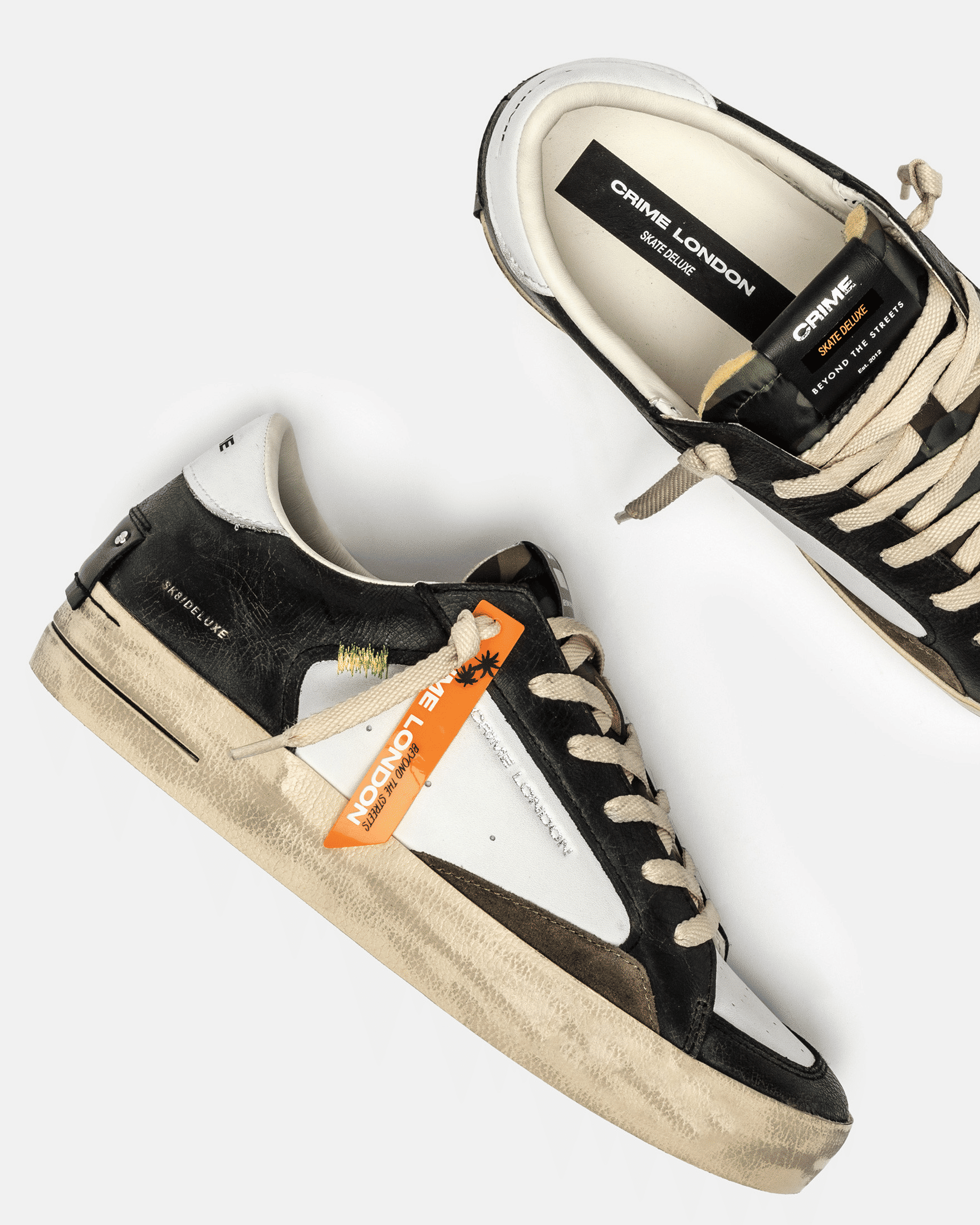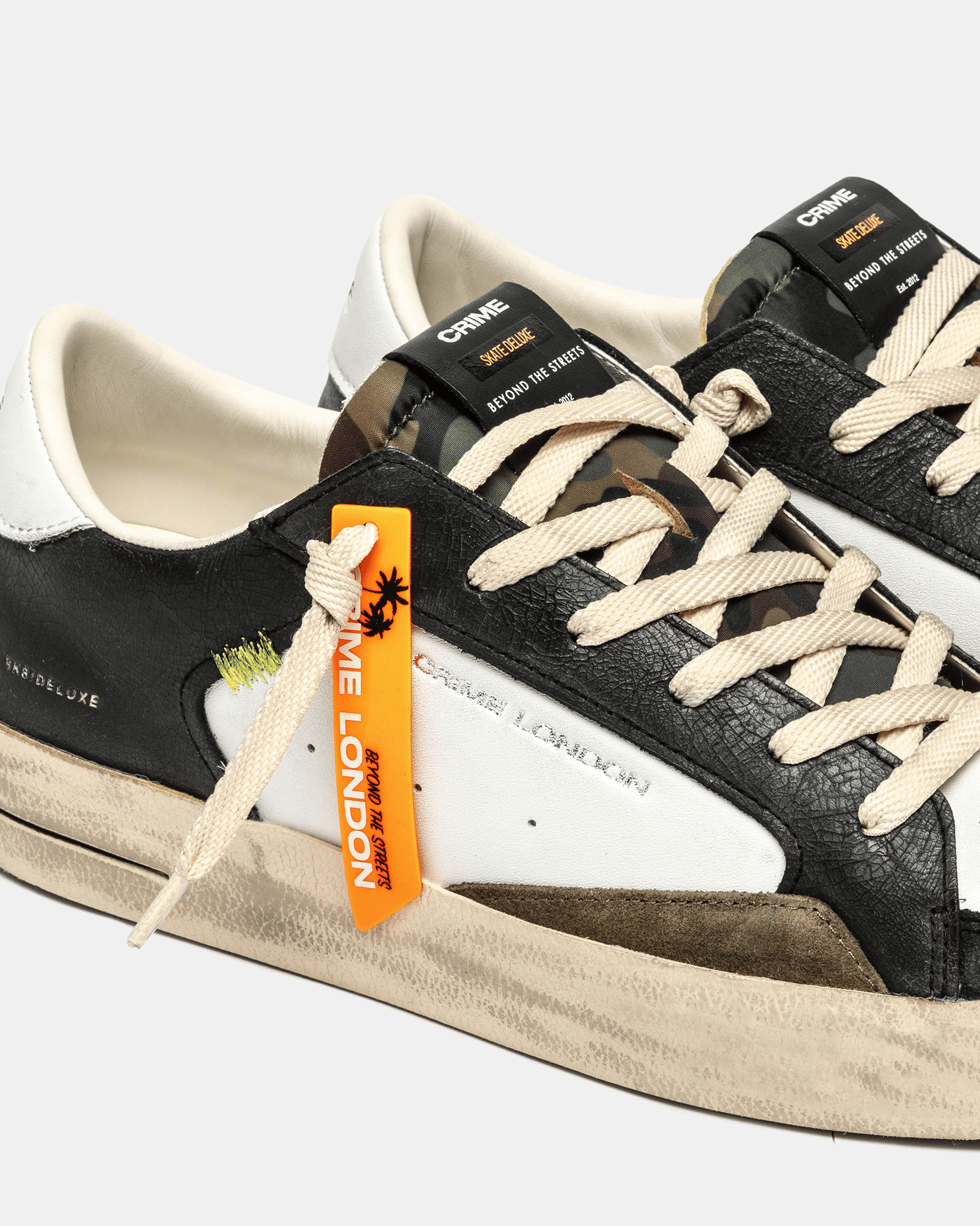 • Tomaia in pelle e cracklé nera, dettagli in suede verde militare