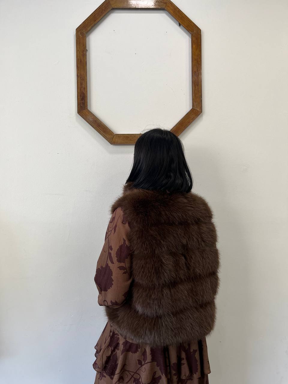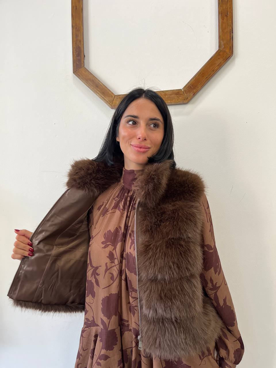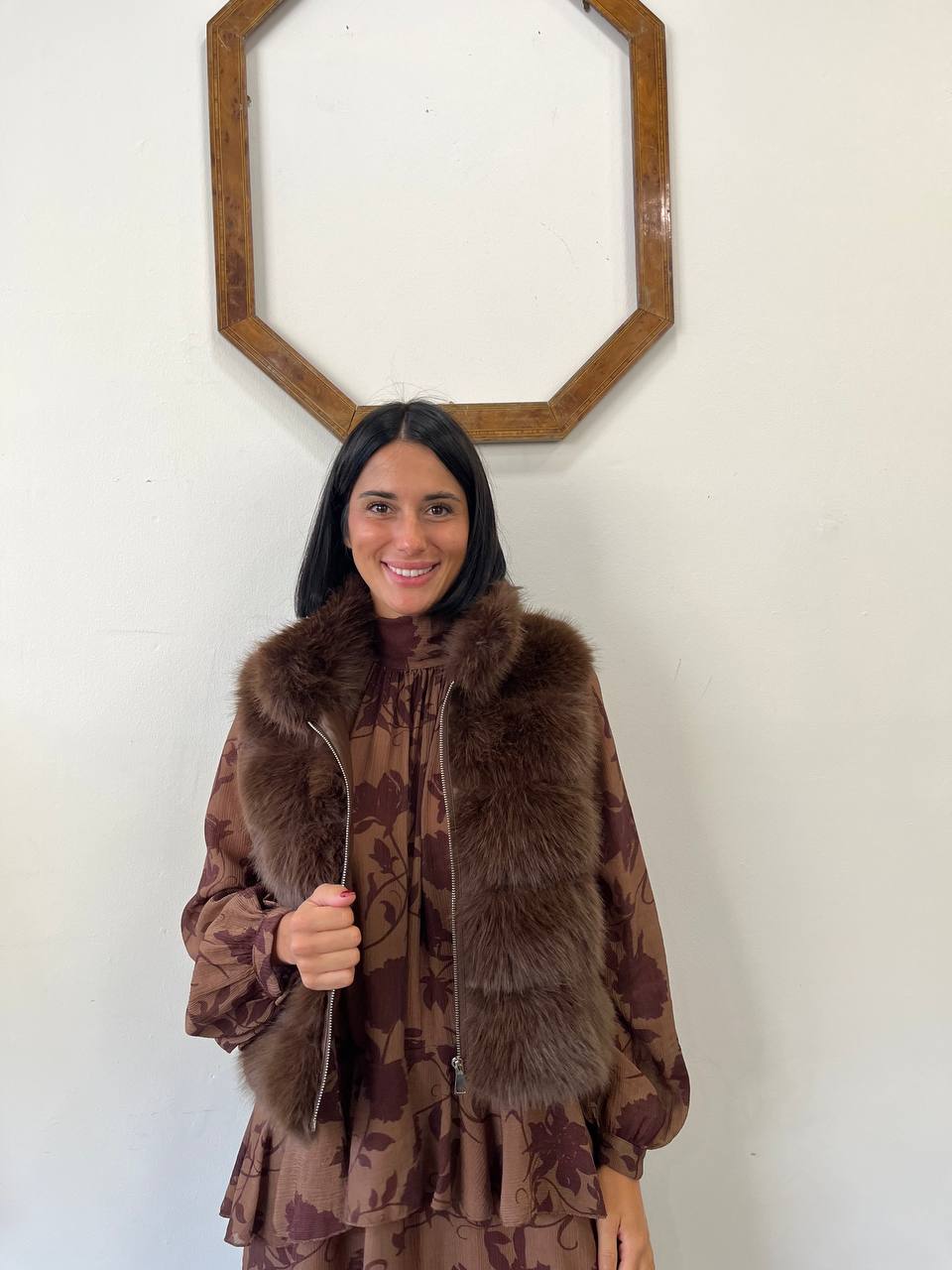 Smanicato corto in ecopelliccia con una calda e morbida texture. Il taglio sciancrato e la cerniera frontale aggiungono un tocco moderno e versatile. Perfetto per essere indossato sopra abiti o maglioni a collo alto, per aggiungere un tocco di stile e comfort al tuo look.