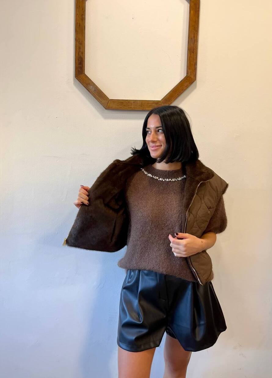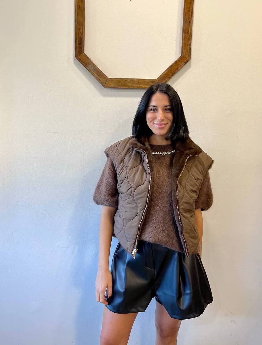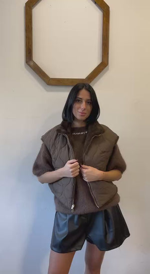 Questo gilet è un capo versatile e caldo. Presenta un lato trapuntato con cuciture decorative a onda e un lato interamente rivestito in pelliccia morbida e accogliente. Il modello ha un collo alto foderato in pelliccia e una chiusura con cerniera frontale.