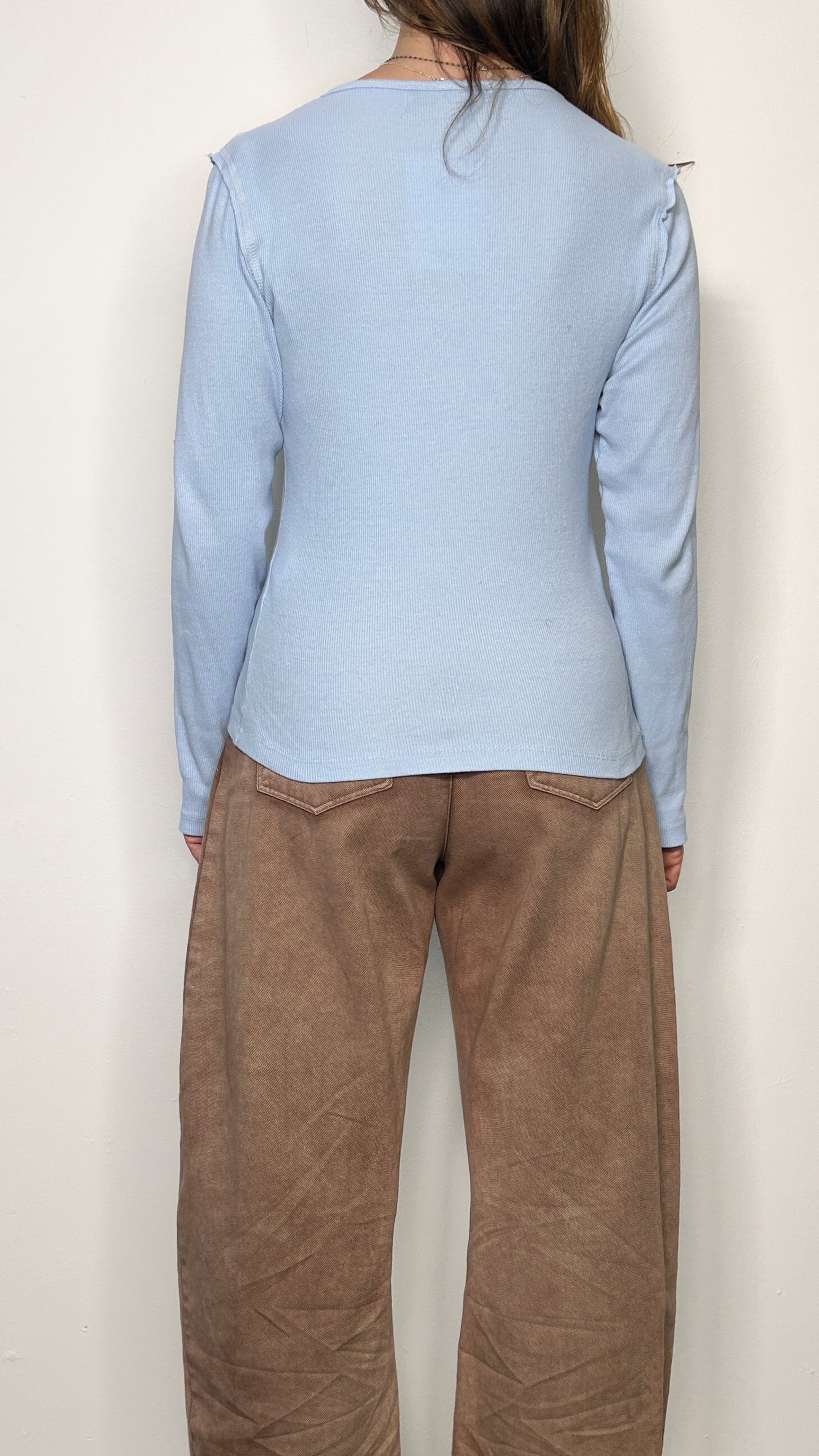 Questa maglia a maniche lunghe è realizzata in un leggero tessuto di cotone con una trama a costine che garantisce elasticità e una vestibilità che valorizza la silhouette. Il modello presenta uno scollo rotondo rifinito e originali cuciture esterne che donano un carattere contemporaneo al design essenziale. E' un capo ideale per completare outfit stratificati o per un look casual-chic quotidiano. Veste fino alla taglia 44.