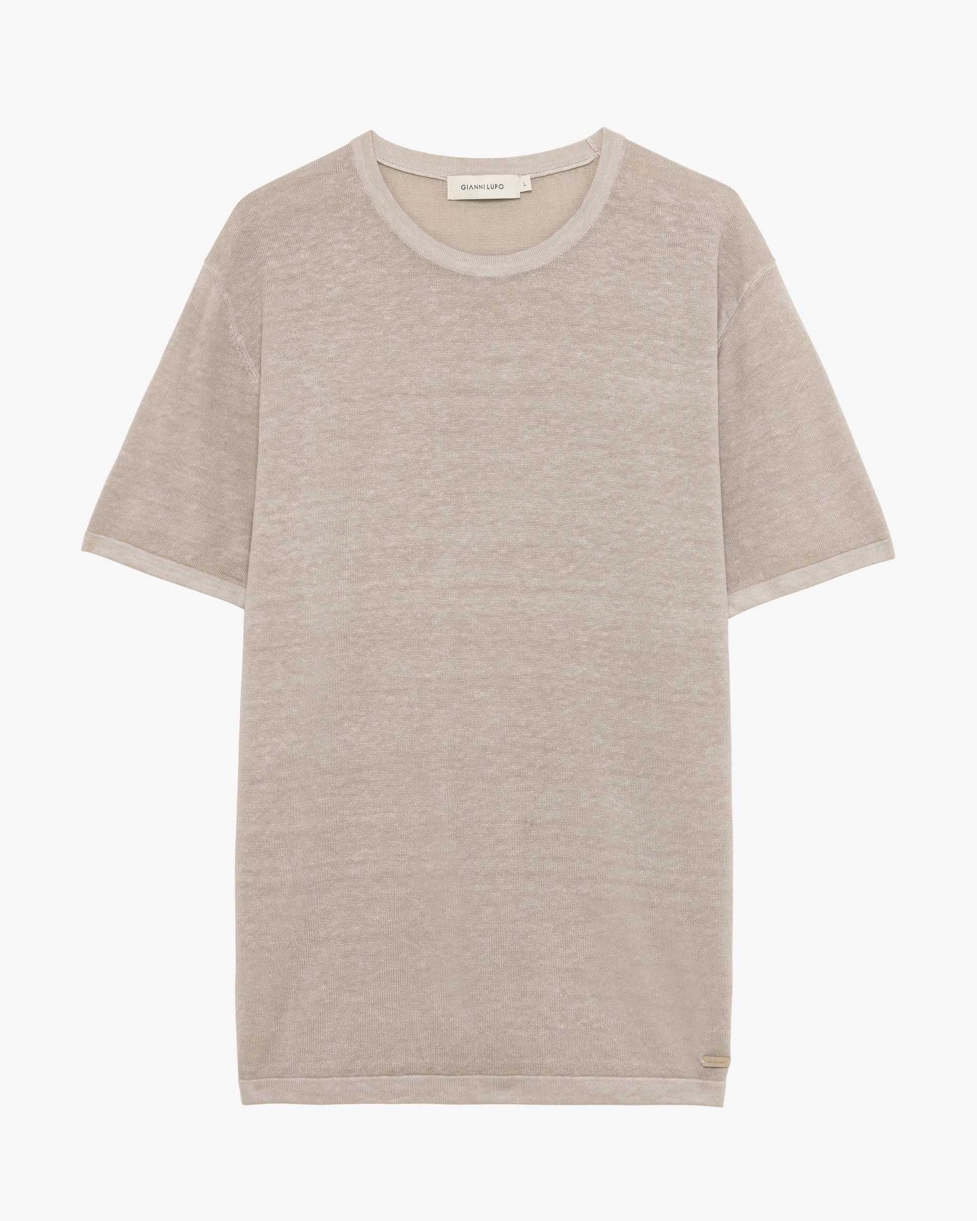 Questa t-shirt a maniche corte in maglia leggera si distingue per una lavorazione dalla texture sottile e uniforme che conferisce al capo una mano morbida e cascante. Completano il modello i bordi lineari su maniche e fondo, insieme a un discreto dettaglio metallico logato applicato lateralmente per un tocco di raffinatezza discreta.