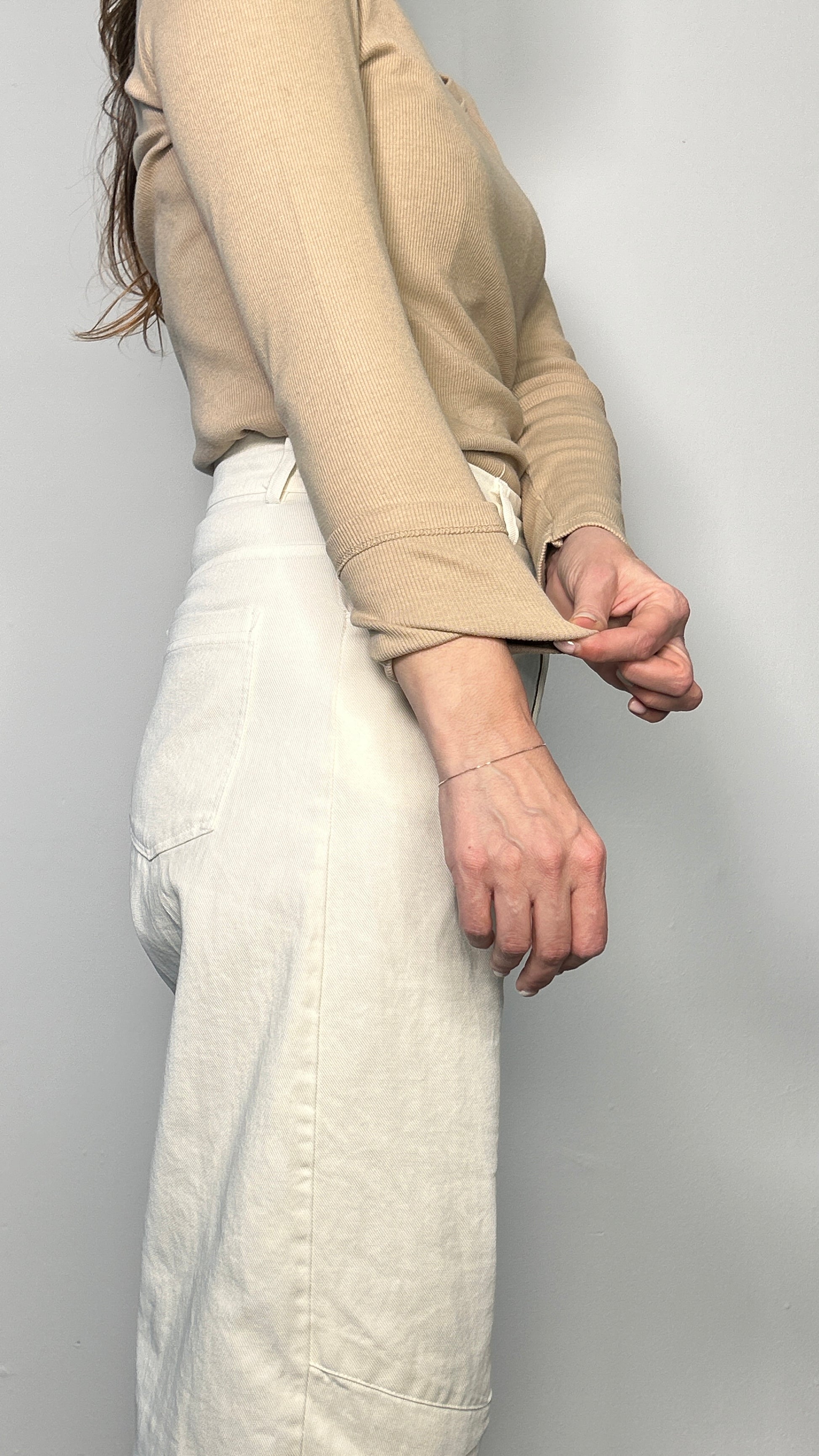Questa maglia a maniche lunghe in cotone a costine si distingue per il suo scollo a V e la vestibilità flessibile che segue le linee del corpo. Il design pulito e le finiture discrete la rendono un capo base estremamente versatile, perfetto per essere indossato da solo o come sottogiacca in ogni stagione. Veste fino alla 44.