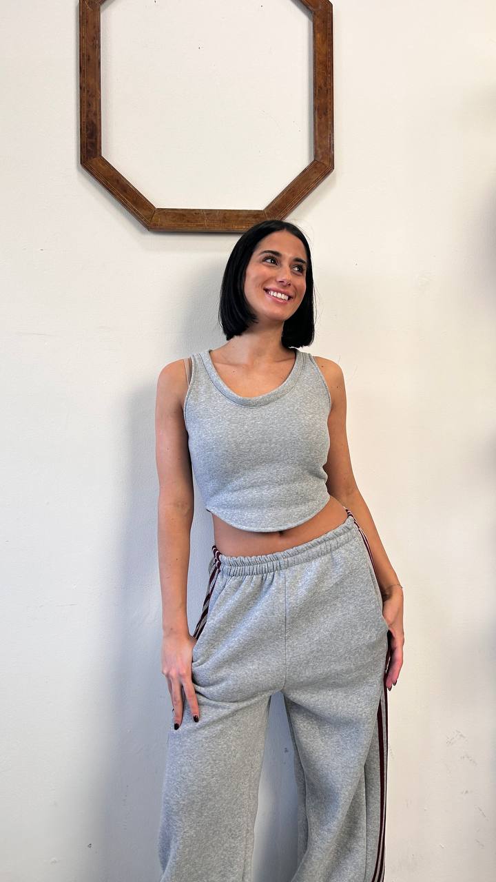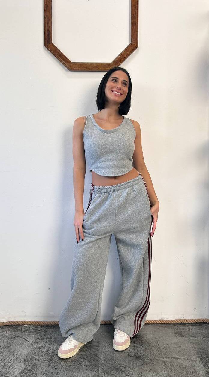 Questo completo sportivo è composto da un pantalone lungo jogger, una felpa crop a maniche lunghe e un top sempre in cotone felpato internamente lo chiude. Si hanno così 3 pezzi unici che possono essere messi insieme. Il pantalone e la felpa presentano delle righe verticali a contrasto lungo il lato.