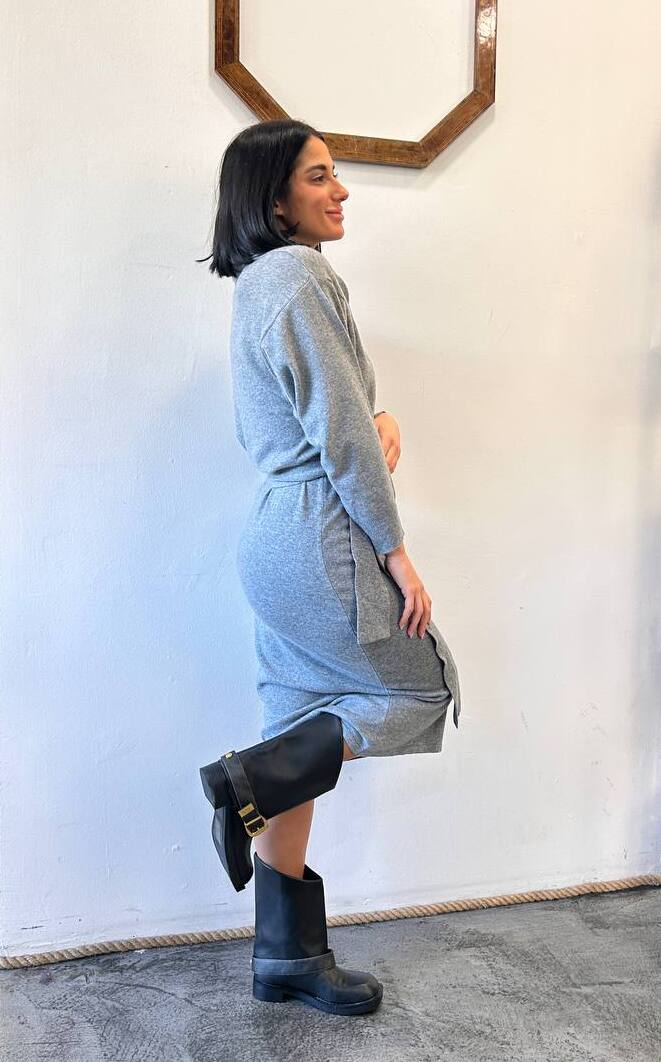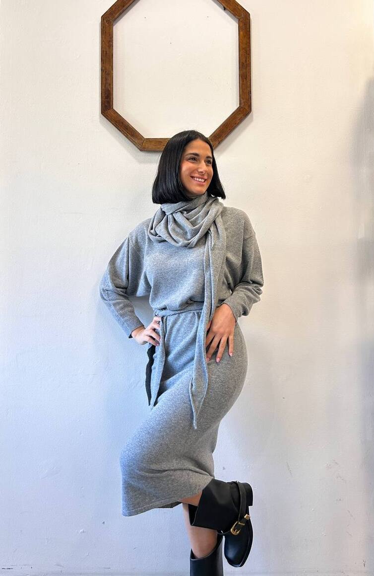 Questo set comprende un abito longuette in maglia e una sciarpa coordinata. L'abito ha un taglio che arriva a metà polpaccio, maniche lunghe e include una cintura in tessuto.