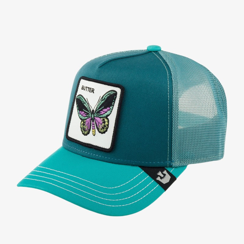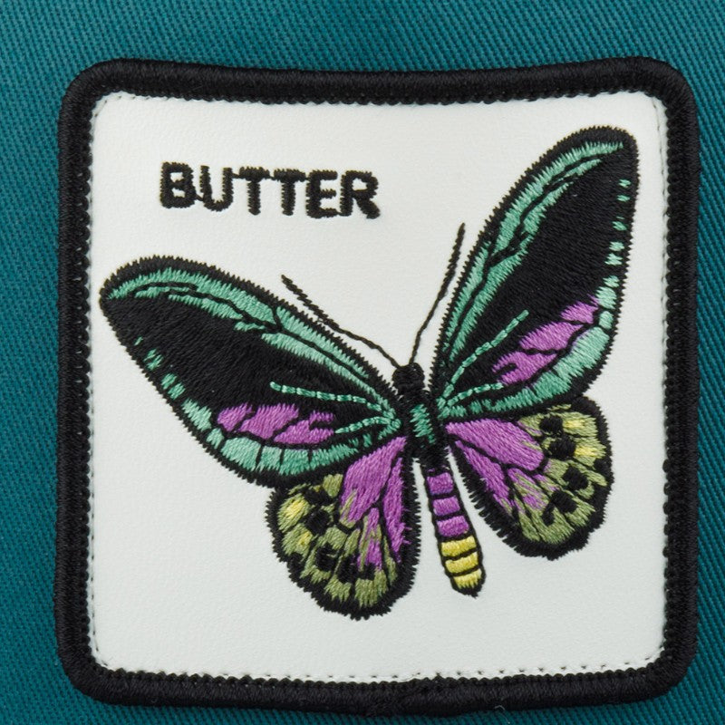 Berretto da baseball butterfly con papillon dell'iconica collezione Animal Farm. Sul pannello frontale è presente una toppa in pelle con ricamata l'immagine di una farfalla e la scritta Butter, che può essere tradotta come burro o in gergo viene usata con il significato di lusinghiero. Sulla visiera curva è presente un'etichetta con il logo del marchio. Una fascia di peluche è cucita all'interno lungo la circonferenza della testa per una vestibilità confortevole.